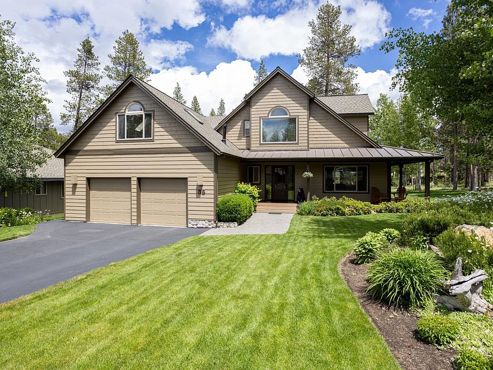 Meticulously maintained NW-style home on the North end of Sunriver. The main level features a spacious great room with built-in cabinetry, river-rock gas fireplace and hardwood & carpet flooring. The kitchen has a clean look and feel with white cabinetry, SS appliances, island with granite top, tiled counters and eating nook (used as a sitting area). The roomy primary bedroom is also on the main floor with gas fireplace and updated bath. Upstairs you'll find two bedrooms, a large bonus room with wet bar that has room for a desk/office setup, and lots of storage. The garage is oversized with a tandem on one side, numerous racks and shelving, and extended wing-walls for extra storage. Outside, offers a covered porch on three sides, expansive back deck with hot tub, and beautiful landscaping. New high efficiency HVAC system in 2022 with air purification, newer water heater, new driveway and pathways in 2020, and new Milgard windows in 2020. Close to golf, pool, & tennis amenities.