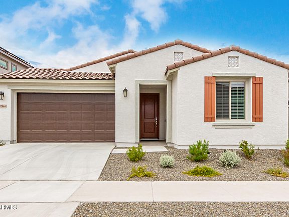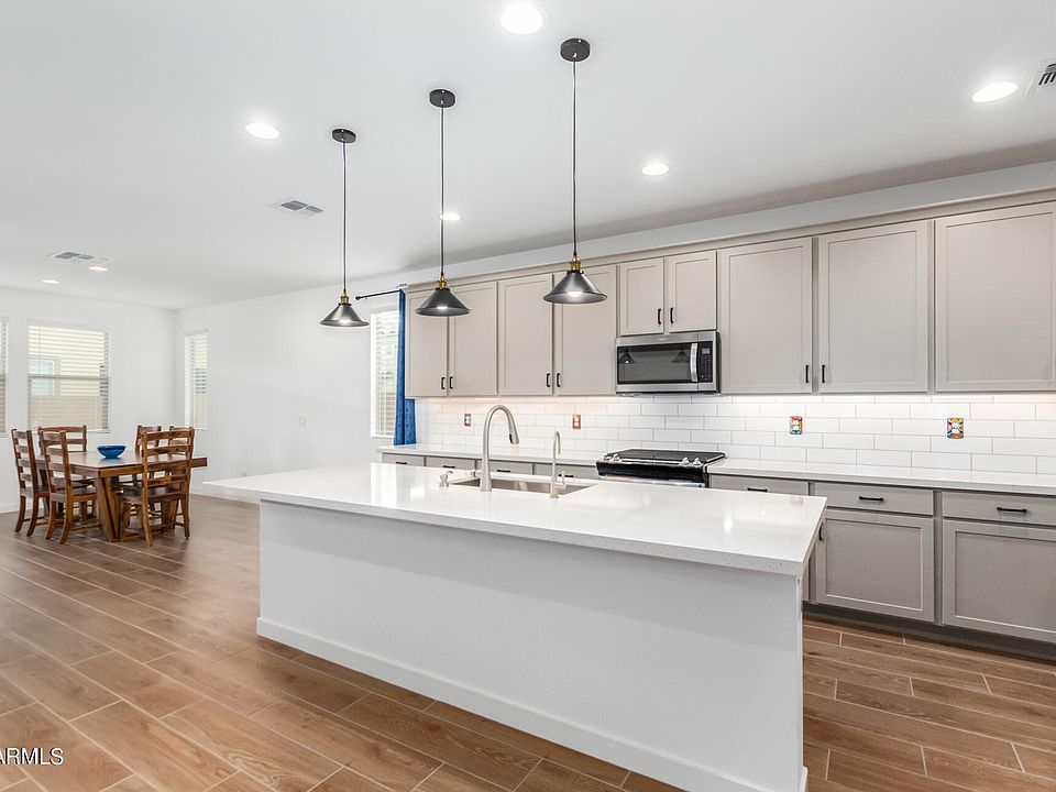 Immaculate 3-bed, 3-bath plus office/den in the award-winning Estrella Mountain Ranch master-planned community. This open-concept home features tall ceilings, wood-look tile, and a gourmet kitchen with quartz countertops, subway backsplash, upgraded cabinetry, large island, stainless steel appliances, and walk-in pantry. Whole house water softener with reverse osmosis connects to refrigerator. The split primary suite offers dual sinks, walk-in closet, and added insulation for comfort and soundproofing. Secondary bedrooms share a Jack & Jill bath. Smart Home system controls garage, locks, lights, thermostat, and security compatible with Alexa, Google, and Apple. EV 240-volt outlet, CAT6 wiring. Washer, dryer, and curtains may convey with an acceptable offer. Enjoy two resident clubs with pools, marina, golf, fitness, trails & dining.