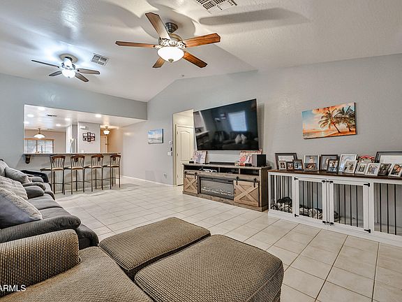 WOW! PRICED TO SELL in Surprise near new Prasada Shopping & Dining! Move-In Ready w/Vaulted Ceilings, Open Layout & Private Backyard Retreat. Step inside & feel the difference—soaring vaulted ceilings greet you with an airy, open vibe that instantly feels like home. This charming 3bed/2ba gem is set in a peaceful, well-maintained neighborhood just minutes from the new Prasada shopping center, dining & outdoor adventure at the White Tank Mountains.The heart of the home is the inviting kitchen featuring a spacious island w/breakfast bar, stainless steel appliances, & plenty of room to gather, cook, & connect. The deep blue cabinets in the kitchen compliment the blue backsplash & add a mediterranean feel. The included washer, dryer, fridge mean moving in is a breeze. The N/S orientation & annually serviced HVAC help keep energy bills in check.an ideal match for Arizona living. Outside enjoy your own private escape w/a covered patio, paver accents, & a grassy area, perfect for pets, play, or simply relaxing under the stars. With community greenbelts, playgrounds, and walking paths just steps away, this home blends comfort, convenience, and lifestyle.