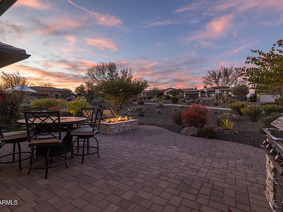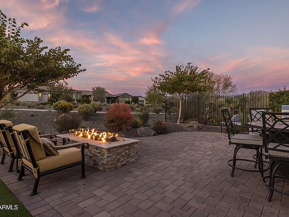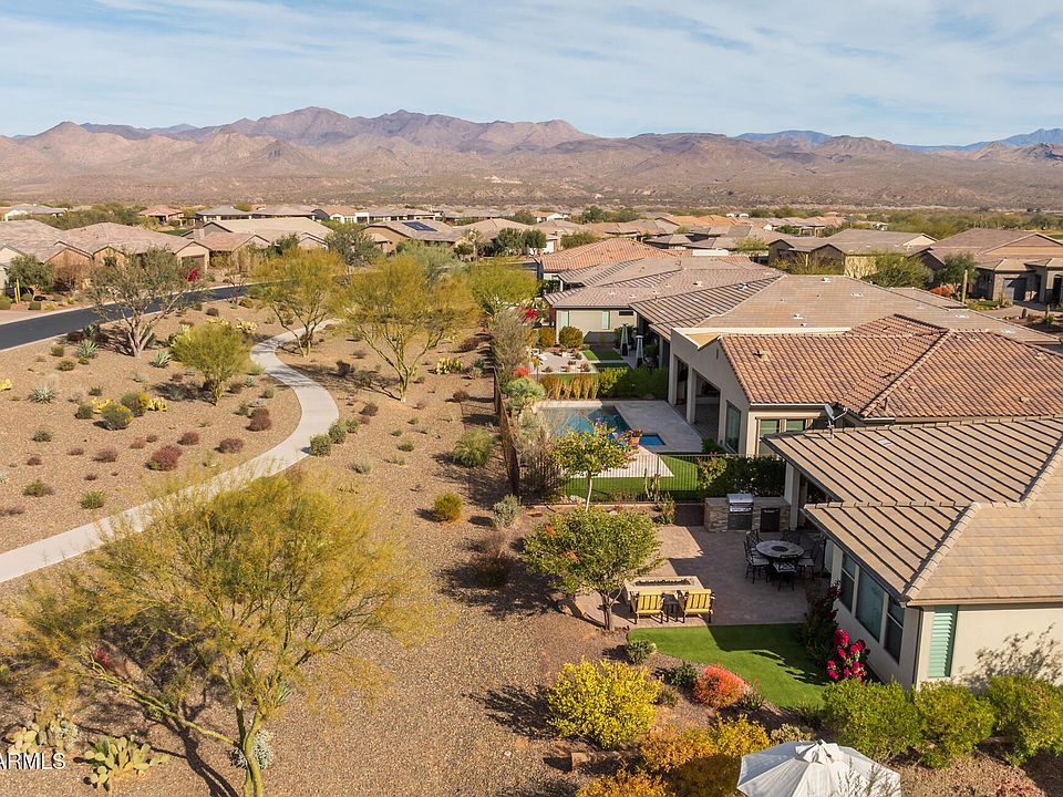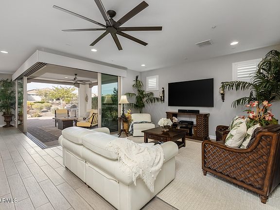 Step into luxury with this beautifully designed home, offering the Nice floorplan and designer finishes throughout. Enjoy Mountain Views and plenty of natural desert space behind for the ultimate private retreat! The great room impresses with a corner sliding pocket door, complete with a motorized privacy screen. The stunning kitchen features modern cabinetry, Built-in Monogram appliances, Quartz countertops, and a spacious island with a breakfast bar. Wood shutters and neutral tones add warmth and elegance throughout. The lavish primary suite boasts wood flooring and an ensuite with dual sink vanities topped with Quartz, a tiled shower, and a generous walk-in closet. Bedroom two is equally impressive with shutters and wood flooring. The oversized laundry room offers exceptional functionality with two built-in desk areas and abundant cabinet space. Designed for comfort, the meticulously landscaped backyard invites relaxation with an extended patio, fire table, and serene Sonoran plants. The covered patio is equipped with an outdoor kitchen complete with built-in bbq, refrigerator, a ceiling fan, and lush privacy vines, creating the perfect outdoor retreat. Additional features include an extended garage with cabinets and a trash fence. Do not miss out on this home!