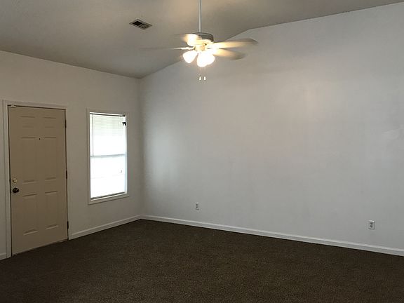 This unfurnished three-bedroom, two-bathroom duplex is located on Barberry Drive in the College Park subdivision. The kitchen features white cabinets, appliances, and countertops, as well as natural light from the window over the double sink for a clean, crisp inviting space. It's equipped with all major appliances, including a stove, refrigerator, and dishwasher. The home has washer and dryer hookups. Open floor plan living room and dining area has sliding glass doors that lead out to a partially fenced in back yard with patio which is fantastic for enjoying time with your pet. The bedrooms each have ceiling fans for added comfort. The duplex has its own driveway and sidewalk and a covered front porch where you can sit and enjoy the day.