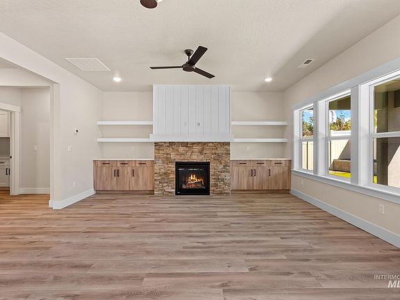 HUGE PRICE DROP! This charming 3-bedroom, 2-bath home offers a perfect blend of style and function. The open kitchen features quartz countertops, a gas range, and luxury vinyl plank flooring. The living area is warm and welcoming, complete with a cozy fireplace and custom built-in cabinetry. The guest bathroom, situated between two spacious guest bedrooms, includes quartz countertops, a tiled shower/bath, and upscale tile floors. The private primary suite provides a peaceful retreat with dual vanities, a fully tiled step-in shower, quartz countertops, and luxury tile floors. Large windows fill the home with natural light, highlighting designer finishes and beautiful trim throughout. Conveniently located near the freeway, Albertsons Marketplace, the YMCA, and Meridian’s bustling shopping and dining area! Plus, enjoy low-maintenance living with HOA-provided front and back lawn care.