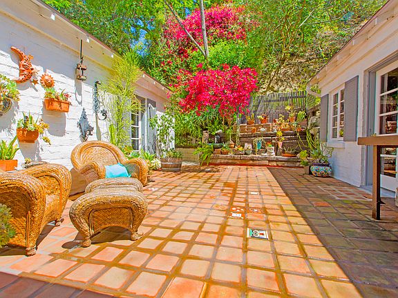 Home buyers seeking a sprawling backyard with a green lush lawn will need to look further. Eco-conscious home buyers seeking the perfect combination of taste, science, low maintenance, conservation, energy efficiency, and location have met their perfect match! "La Cour La Loma" is a 2 bed 2 bathroom 1,283 square foot home built in 1947 by a JPL engineer who had a passion for energy efficiency and solar concepts. He designed the home to stay cool by having only one small window on the afternoon sun side of the house thereby blocking the sun and street noise by with it’s block walls. "La Cour La Loma" is located 10 minutes from Downtown, in the prestigious San Rafael Hills on a quiet tree lined street. Its U-shaped floor plan features a central courtyard that is accessible from the living room, breakfast nook, and the master bedroom. Inside, our home boasts impermeable block walls, gleaming tile flooring with radiant heating to keep your toes warm in the winter, a Japanese soaking tub, vaulted ceilings in the living room, a commercial gas stove featuring a 15 BTU heating unit, and a cedar closet. Outside there is a newer roof, the drought-resistant landscape, a timer-controlled drip system for the "secret" vegetable-herb garden, and the courtyard perfect for your soiree or simply relaxing. The architecture, design, and positioning of the home take full advantage of the sun's radiance keeping the home bright while the large Liquid Amber Maple Tree in the front yard provide shade and natural ventilation without the expense of air conditioning. During the warmer days, a granite "bedrock” hill located on the north side of the property provides a shield of shade keeping the home cool. Radiant heat tile flooring allows the owner to walk around barefoot even on the coldest days, as the floors will be toasty warm. The highly efficient, cook friendly galley-style kitchen has a protective knife drawer with magnetic strip, hidden cutting board, several pull outs in the pantry & cupboards, and extra storage in the banquet including a file drawer. The dragonfly fabric of the banquet is matched with dragonfly hardware on the cupboard pulls. The banquet was also designed to pull out making a sleeping area for an extra guest. The dishwasher, sink, and commercial-style faucet were all installed within the last year. The commercial gas stove features a 15 BTU heating unit and pullover styling for heavy pots, a favorite of discerning cooks. The butcher-block counters were also newly refinished. The Master Bedroom has a wall of closets as well as a walk-in closet with a fitted storage wall, cedar closet, high quality Container Store wall unit, and an area designed for plastic tub storage of out of season clothes and/or suitcases. All baskets and racks are included in the sale. A custom built-in desk unit with file cabinet provides a quiet work area in the bedroom. Both bathrooms show exceptionally well, and the second bathroom features a Japanese soaking tub. The yards feature drought tolerant succulents requiring little maintenance except for the small lawn in the front yard. The hill and the vegetable garden above are on a timer-controlled drip system. During the winter, the drip is turned off on the succulents, as they usually require no water. The hill is bedrock, a favored place during earthquakes. "La Cour La Loma" has withstood four major earthquakes with absolutely no damage.