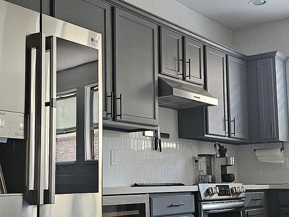 Epoxy-finished garageModern designRecessed lightingTile backsplashCool-gray shaker cabinetryLarge walk-in closetGranite countertops