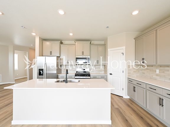This home offers a spacious open-concept layout with a versatile flex room, ideal for use as an office or den. The kitchen, the heart of the home, features energy-efficient stainless steel appliances, a large kitchen island, a walk-in pantry, and a quartz-topped breakfast bar. The seamless flow between the kitchen, dining, and family rooms is perfect for gatherings, with natural light illuminating the dining area and sliding glass doors leading to a large covered patio. The expansive master retreat includes a luxurious bathroom with a double-sink vanity, soaking tub, glass-enclosed shower, and walk-in closet. With four additional bedrooms, a fenced backyard, and front yard landscaping, this home is perfect for comfortable living. The community offers unmatched convenience with easy access to Denver International Airport, downtown Denver, and Barr Lake State Park for outdoor adventures.