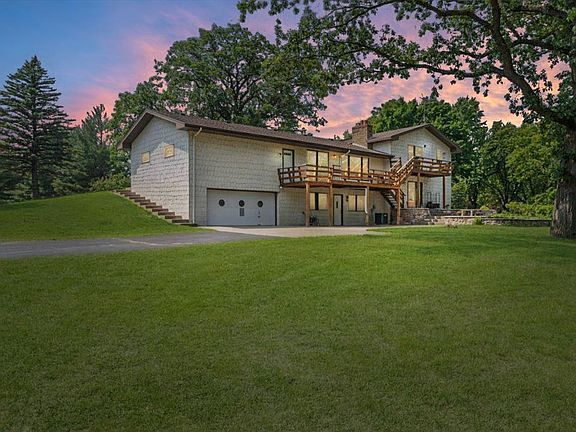 This beautifully cared-for, one-owner home is nestled in a serene, park-like setting on 6 acres and is perfect for any collector, hobbyist or someone with lots of toys. Surrounded by a variety of mature pines, healthy oaks, flowering & fruit trees, this nature-filled retreat offers tranquility & frequent visits from local wildlife. A garden terrace, patio, and full-length deck—accessible from every level—complement the lush perennial landscaping and create a peaceful outdoor oasis. Inside, the main level features an open layout with vaulted knock down ceilings, gleaming natural oak floors, and a corner gas fireplace, all with views of the stunning back yard. The updated kitchen is open & spacious with granite counters & stainless steel appliances. Upstairs, you'll find three bedrooms on one level, including a primary suite with a private bath, custom closet & walkout to the multi-tier deck. On the lower level, enjoy a generous family room with a wood-burning fireplace and patio walkout, plus an office space, bathroom, and a spacious laundry room. The lowest level provides flexible living space – ideal as a fourth bedroom or den – with its own secure patio walkout & connects to a mudroom that leads to a heated lower-level garage/workshop. Outdoor features include a fenced garden with dual gates, storage sheds, and two pole buildings with electric service. The 40x60 building includes a storage mezzanine & is ideal for animals, hobbyists, or collectors. The other outbuilding is set up for additional storage. As a bonus, this home has both an electric (off-peak) furnace & a natural gas furnace, offering flexibility & energy efficiency. Quality Pella windows & a low-maintenance exterior with covered gutters add year-round comfort & convenience.