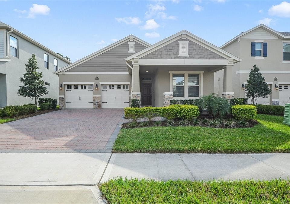 Prepare to be impressed with this nearly new Bellmore model home in the Waterleigh community. This lakefront beauty offers a picturesque water view with incredible sunsets and extra large backyard, perfect for relaxing or entertaining. The one-story home features 4 bedrooms, 3 full baths, and an open floor plan. The owners have upgraded and screened the oversized patio to enjoy the backyard oasis. The well-appointed kitchen boasts stainless appliances, 42-inch upper cabinets, a walk-in pantry, and a large island with quartz countertops. The front driveway and expanded rear patio are made of brick pavers, and the covered and screened lanai is an ideal spot to unwind. Enjoy world-class amenities, schools, Publix and shopping just a short walk away, and Disney is only 5 minutes by car! HOA includes exterior yard maintenance, pest control, and annual mulching, making this home perfect for full-time residency or a vacation retreat.