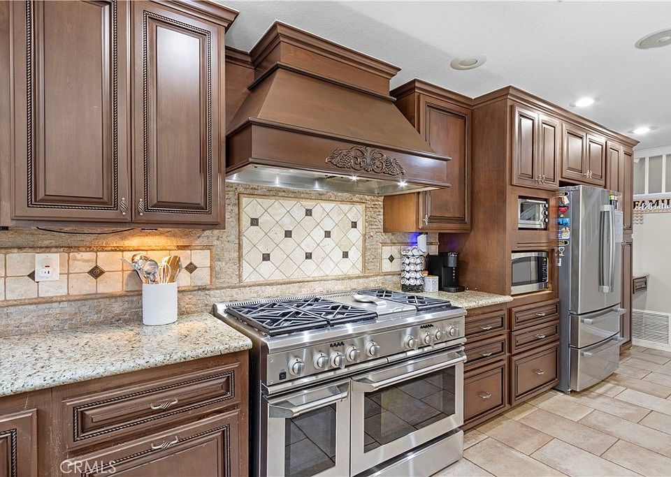 This 3-bedroom, 2.5-bath home features a bright, open floor plan with fresh interior and exterior paint, porcelain tile flooring downstairs, and a cozy wood-burning fireplace with gas hookup. The remodeled gourmet kitchen boasts granite countertops, custom cabinetry, travertine backsplash, a massive 48” 6-burner professional range with griddle, large center island with built-in beverage fridge, and newer dishwasher and disposal.