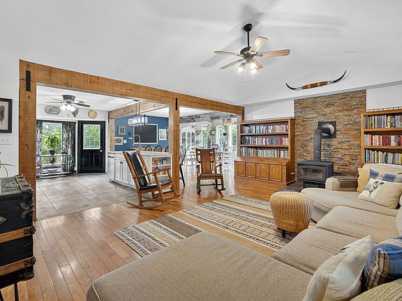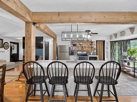 Ranch homeCountry chic kitchenWooded retreatSurrounded by timberTile floorsOpen flowQuartz counters