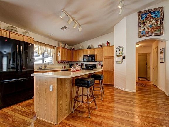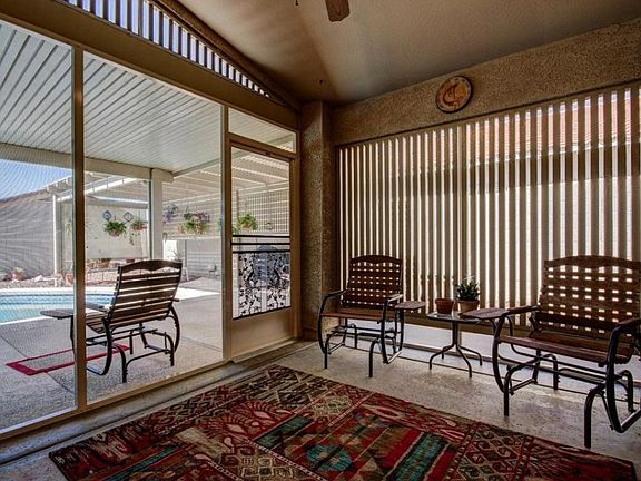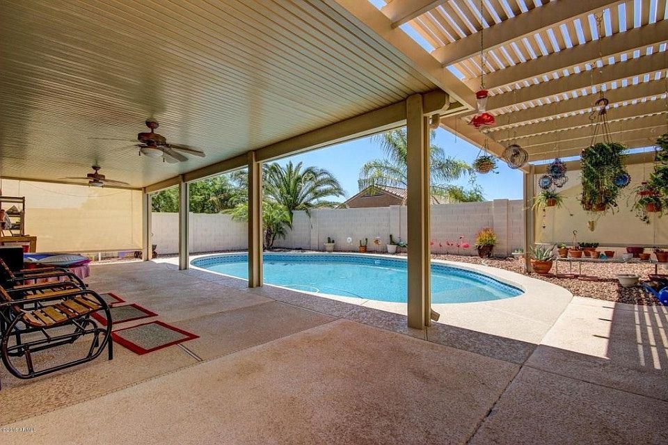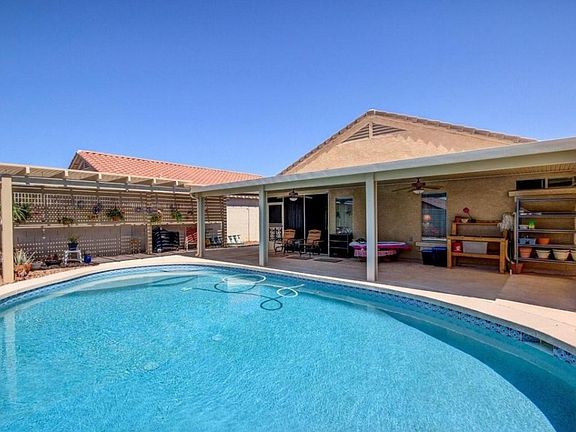 Beautiful Oasis in the Desert. Lounge Poolside and enjoy the Sunsets. Spacious Wood Floors, Great Room w/Vaulted Ceilings! Large Breakfast Bar Island with adjacent dining area. Medium Tone wood Cabinetry, Sleek Black Appliances and Plenty of Counter Space. Beautiful Screened Arizona Room/Lanai with Large Extended covered Patio with Ceiling Fans and a Grill Station/Bar area next to the sparkling POOL! Perfect for Entertaining! Master Bedroom boasts walk in closet, Master Bathroom has tile floors w/ walk in shower & built in stool. Security Screen door and Alarm System. Extra insulation added to entire house as well as an insulated 2 car garage door. Slide out shelves in most kitchen cabinets. A Rare Dead End Cul De Sac Find and this OASIS will not be on the market long... See it TODAY!
