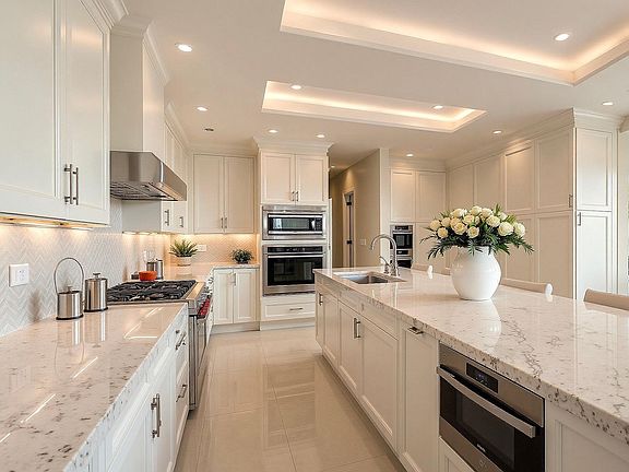 Exceptional storageHandsome stone paver drivewayIntricate ceiling detailsNatural lightLakeside swimming poolRich walnut accentsViking appliances