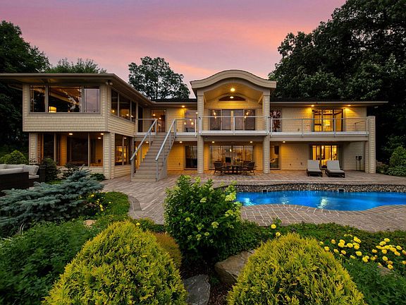 Entertaining continues on the walkout lower level, where a full wet bar, stone fireplace, and lounge spaces open directly to the pool terrace. A secondary laundry provides added convenience—especially when hosting guests for long summer weekends. The lakeside swimming pool is an extension of the home’s resort-style living, surrounded by mature landscaping that enhances privacy and frames panoramic lake vistas.