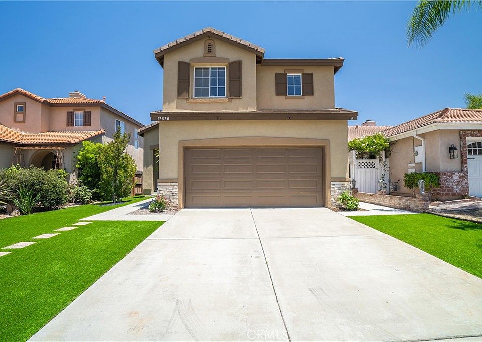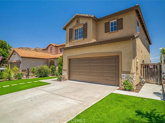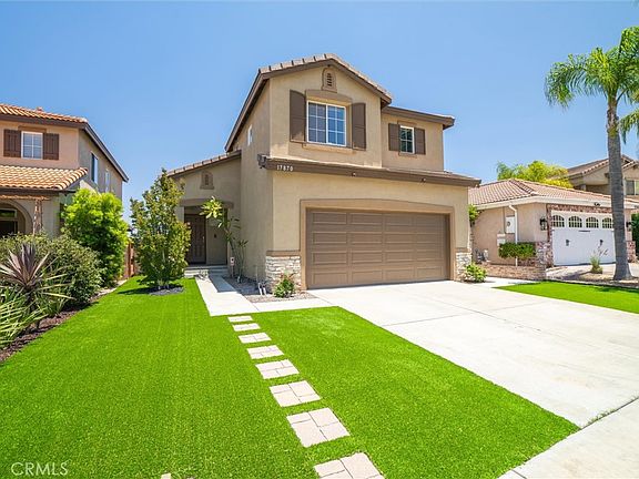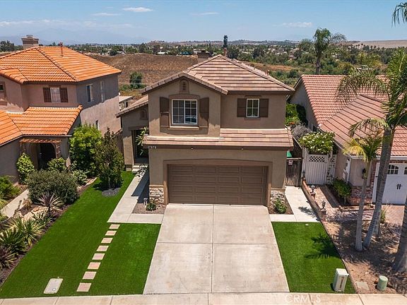 BACK ON MARKET! Check out this stunning 2-story Lake Hills home on a cul-de-sac that is immaculate inside and out. As you drive up, you will notice the impeccable front yard with artificial turf and other low maintenance and drought tolerant features, and as you step inside, the entry opens up to a lovely living room with cathedral ceilings, a cozy gas fireplace and a beautiful staircase with an oak banister. The perfect place to unwind and relax after a long day overlooking a panoramic view into the backyard and beyond. The cozy eat-in kitchen features Quartz Counters including the island and is a dream for any family chef, with a view of the valley below and the picturesque city scape behind the home. Downstairs, you'll find a nice laundry room with storage, a welcoming half bathroom, and garage access to a 2-car garage. Upstairs, the cathedral ceiling in the primary bedroom is a sight to behold, with a great view overlooking the hills, mountains and city lights below, and the easy to maintain backyard with artificial grass as well. The backyard gives off loads of natural light. The primary bathroom boasts a large oval tub with shower, double sinks at the spacious vanity, a separate toilet room, and a large walk-in closet. Down the hallway, you'll find a linen closet and counter area with plenty of space to display decor, a charming bathroom with a tub and shower, and two bedrooms with views overlooking the front yard. This house has been impeccably kept, including the pristine wood and ceramic flooring. Enjoy the relaxing view of the backyard from the fabulous covered patio, complete with 2 overhead fans and matching lighting. The backyard features a lot of privacy, with tall fencing, trees and plants enhancing the privacy with the only 2 neighbors you have. This community boasts a Low HOA and Low Taxes. Don't miss out on this incredible opportunity to own this beautiful view home. Schedule a viewing today and experience the true beauty of this gorgeous property.