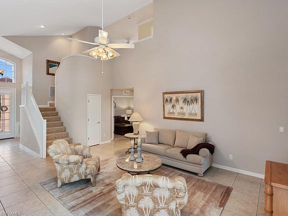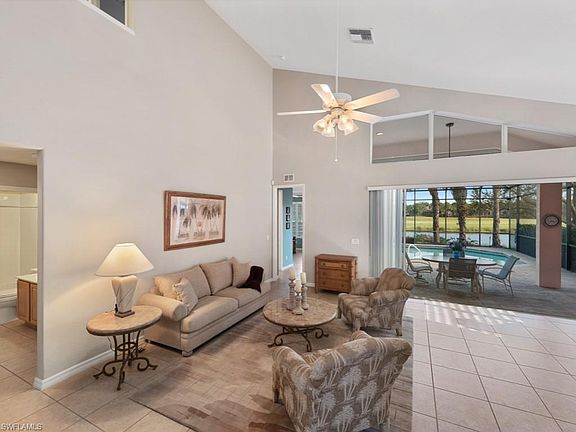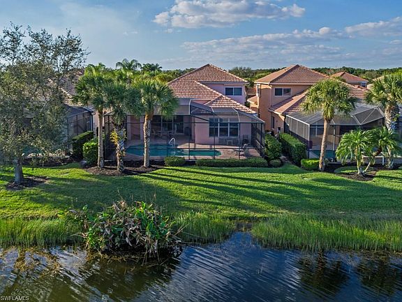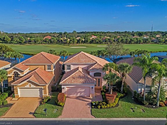 This spacious single-family home has a gorgeous view of the water and 11th hole of Miromar Lakes' Signature Championship Golf Course. The open-concept two-story plan offers a spacious great room kitchen area and formal dining. The renovated kitchen features light cabinets and stainless steel appliances. The first-floor master bedroom suite overlooking the lake has a private door to the lanai, walk-in closet, linen, dual sinks, tub, shower, and water closet. A second bedroom/office, bath and laundry are located on the first floor. Upstairs the airy loft space overlooks the great room with an additional full bath and bedroom. This highly desirable southeast facing home has an expanded pool deck and lanai. Miromar Lakes offers 700 acres of freshwater lakes, with boating, fishing, swimming, water skiing, 3 miles of sand beaches, Caribbean-style beach grill, clubhouse, pool, full-service spa, fitness center, member golf, tennis, and many other amenities. The award-winning community is across from Florida Gulf Coast University, 10 minutes from Southwest Florida International and conveniently located to several area shopping districts.
