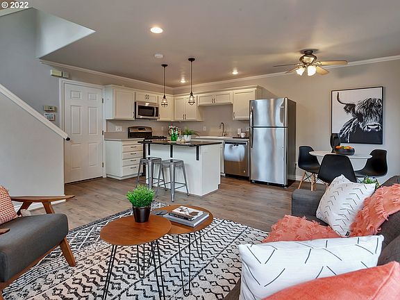 Tastefully updated townhome in the centrally located Aloha. Open concept main level features cozy living room complete with fireplace which opens up to the light and bright kitchen and dining. Large sliding doors lead you to the backyard with spacious patio. Upstairs you'll find the primary suite, 2 additional bedrooms, and a common bath. Updates include newer laminate flooring on the main, newer carpet and newer interior paint throughout. Close proximity to shopping, dining and entertainment.