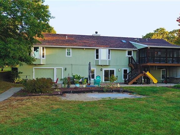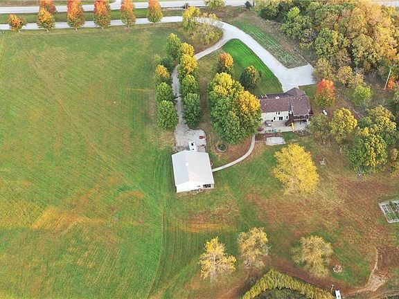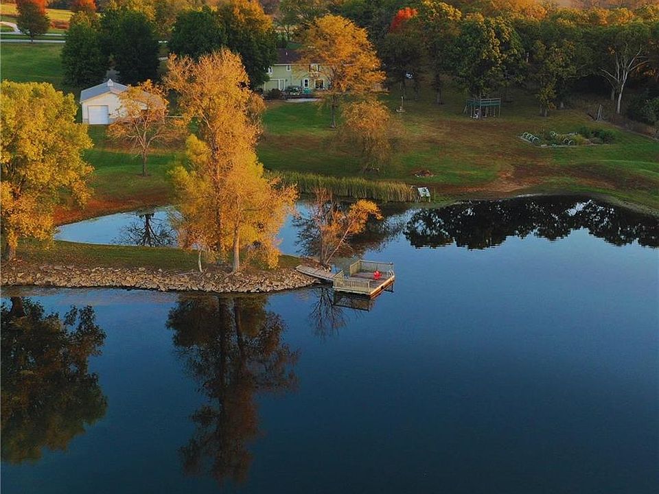 From the moment you turn onto the red maple lined drive, you're welcomed by a canopy of seasonal color that sets the tone for this tranquil country property. Nestled on 14.4 groomed acres, this 4-bedroom reverse ranch offers the space and setting to bring your rural lifestyle dreams to life—whether you're hosting extended family, entertaining the neighborhood, or exploring the possibilities of a hobby farm. The home has been thoughtfully updated with new exterior paint, exterior doors, updated flooring and carpet, lifetime warranty windows, and a remodeled kitchen featuring upscaled granite countertops. The elevated screened porch is a favorite spot to start or end your day—sip your morning coffee as the sun dances across the backyard pond or gather for evening chats enjoying the country air. Downstairs, the walk-out basement offers flexible space for entertaining, with an overhead door opening to a massive patio—ideal for hosting outdoor parties or family celebrations. A built-in slide adds fun for the kids, while adults can unwind in the hot tub or float in the seasonal above-ground pool. Whether you're casting a line in the stocked pond, watching wildlife, or teaching the next generation to fish, the pond is definitely a year-round source of fun & relaxation. Off the southwest corner of the home, the 30' x 50' insulated shop with pull-through overhead doors and a 12' x 50' lean-to that offers endless possibilities. Use it for equipment storage, a workshop, or convert it into a studio or gym. With power, insulation, and easy access, it’s ready to support all your hobbies, business ventures, or weekend projects. Located just minutes from Paola and with easy access to Kansas City, this property offers the peace of country living without sacrificing convenience. This is truly a place built for memory-making—and it's ready for the next chapter!