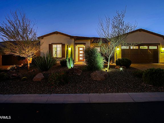 This stunning resort-style deam home is perfect for entertaining and offers the epitome of luxury living. Located in the highly sought affer Trilogy at Verde River, this 2 bdr-plus den/office/3rd bdr. 2.5 baths residence spans 2,441 sq ft and is designed for comfort and style. The kitchen is a chef's paradise, featuring stainless steel luxury appliances, an upgraded Thermador oven with convection, a spacious granite island, ample cabinet space, custom lighting throughout. Serve your guests beverages from the custom wine bar area with 2 wine chillers, making every gathering special. Step outside through 20 ft of sliding stacked patio doors and backyard oasis Entertain around the sparkling heated pool, outdoor kitchen, fire pit, and extended covered patio equipped with misters, infrared heaters, auto roller sunshades Tesla solar panels provide energy effeciency and significant savings on power costs.