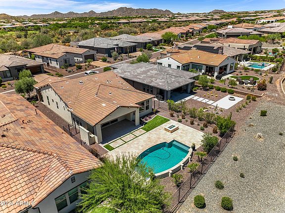 This luxurious home in the heart of prestigious Trilogy at Verde River is the pinnacle of luxurious desert living offering spectacular PANORAMIC MOUNTAIN VIEWS and a PRIVATE HEATED AND CHILLED SPARKLING POOL. Loaded with incredible features and upgrades this home is a true gem. The generous Great Room, complete with a sliding Wall of Glass, custom built-in wall unit and electronic window coverings is the perfect place to relax and unwind. The Kitchen is a culinary enthusiast's dream, featuring all stainless-steel appliances and exquisite details such as granite countertops and beautifully upgraded cabinets. The Smart Space includes a custom built-in desk area and a walk-in pantry, catering to both convenience and style. The master retreat is a true sanctuary, featuring a spa-like en-suite bathroom with custom barn doors. The open floor plan seamlessly blends indoor and outdoor living, creating a harmonious space for relaxation and entertaining alike. One of the highlights of this stunning home is the exceptional outdoor living area, featuring an oversized covered patio with a built-in grill, making it the ideal spot for al fresco dining. Situated on a spacious lot, this property offers plenty of room for outdoor activities, whether you want to lounge by the sparkling pool, gather with friends or family around the built-in Firepit, or simply soak in the Arizona sunshine.