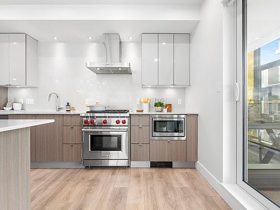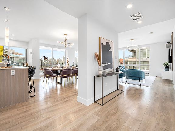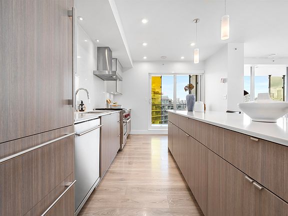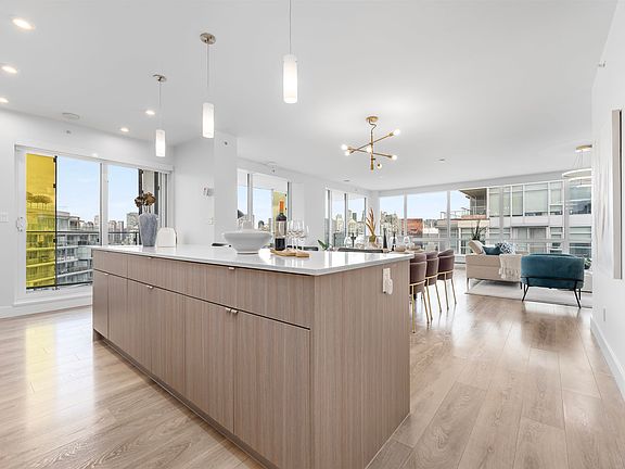 Enjoy waterfront living in this 3 Bedroom + Den, 3 Bathroom penthouse at Epic at West in Olympic Village. Bright & spacious with large windows providing views of the downtown city skyline, tranquil False Creek waterfront & the North Shore mountains. Featuring 8’8” ceilings, A/C, 9' kitchen island, Quartz composite counters & backsplash, wide plank laminate floors, porcelain tiles & remote blinds in the living room. Contemporary luxury including an integrated sub-zero fridge, Wolf gas range, Blomberg dishwasher & washer/dryer, a wine cellar room with thermostat controls, dual-vanity in primary ensuite, walk-in pantry/storage, 2 balconies & a private solarium off the primary bedroom. With 2 side by side parking & 3 lockers! SHORT TERM RENTAL FRIENDLY!