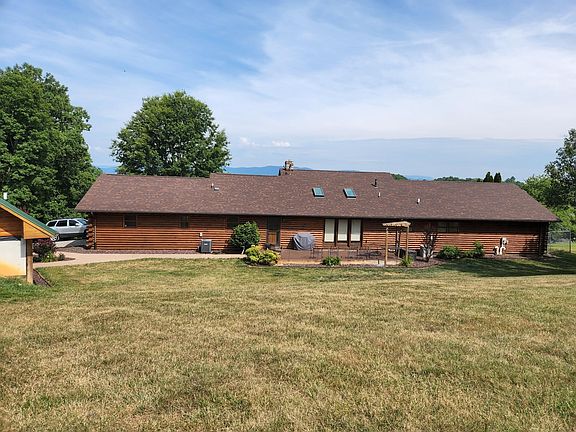 Beautiful one-level log home in Botetourt County with spectacular mountain and sunset views! Nestled on 3+ acres, this one offers a ton of upgrades. 4 bedrooms, 3 full baths with over 3000 ft/2 of living space. Fantastic remodeled kitchen with leathered granite, custom soft close cabinets, S/S appliances, tile backsplash. Recessed lighting, new 30 yr ARCH roof in 2022, tankless water heater. Spacious floorplan throughout that is open and bright. Large great room with cathedral ceilings, stone fireplace. 30x32 detached garage (2017) log/stacked stone. Above garage loft (roughed in) space perfect for apartment, office, etc. Enjoy the views relaxing on the covered front porch or entertain on the back deck. This one is ready to move into and enjoy!