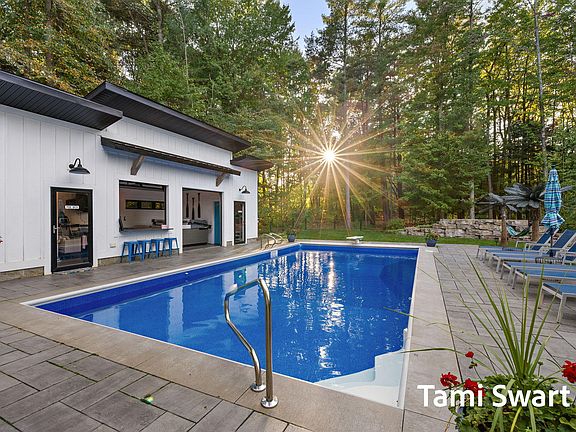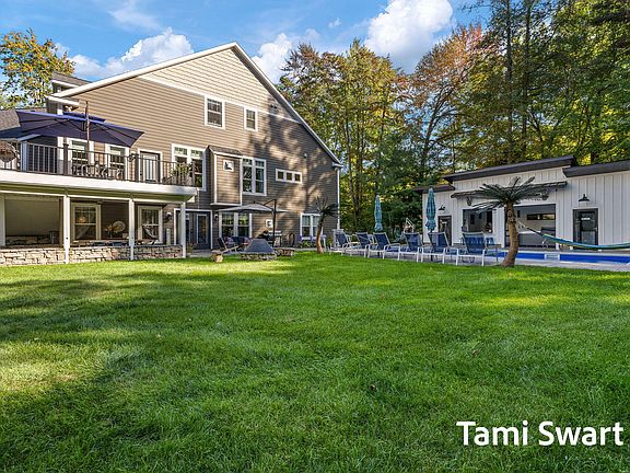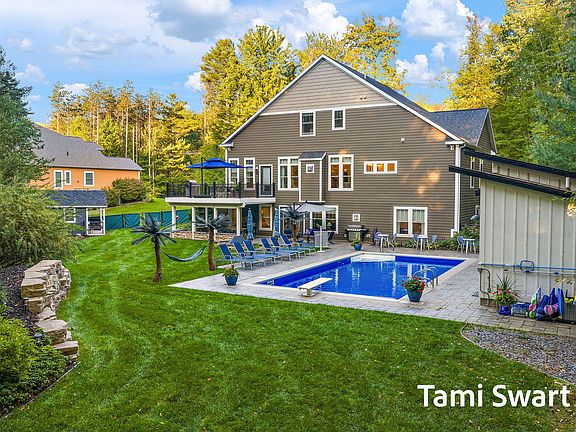 Resort Living at Home-This stunning Spring Lake retreat is more than a gorgeous home—it's a lifestyle designed for entertaining, relaxing, and making memories. With space and flexibility for everyone, this 1.68-acre property truly feels like your own private resort. Step outside to a heated inground pool surrounded by a Rosetta Stone paver deck, a year-round pool house with full bath, laundry, bar, and hot tub—complete with custom glass garage doors that open up to bring the fun inside out. Lounge under hammock-ready commercial palm trees, cast a line in the fish-filled pond with fountain, or gather around the sand area and fire pit. Kids will love the swing set and playhouse while adults enjoy resort-style relaxation. Inside, three levels of open living space offer flexibility at every turn. The main floor boasts a chef-friendly kitchen and primary suite for easy everyday living. Upstairs, the oversized bonus room can be a bedroom, movie theater, or game room. The walk-out lower level includes its own kitchen, fitness space, custom playhouse with loft and slide, plus a bar area and tiled bathroom with heated floors for year-round comfort. All of this is perfectly located across from 15 miles of bike and walking trails, with the yacht club, country club, and easy highway access just minutes away. Life is an adventure hereyou'll never want to leave!