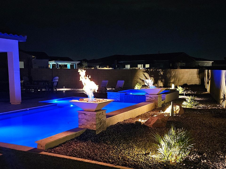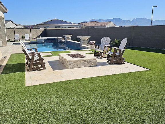 Exquisite Luxury Home in CantaMia at Estrella! This beautifully upgraded 2-bedroom + flex space, 2-bath home offers resort-style living inside and out. The backyard is a private desert oasis featuring a sparkling pool with built-in spa, water features, fire bowls, firepit, travertine decking, lush artificial turf, and professionally designed cactus landscaping.