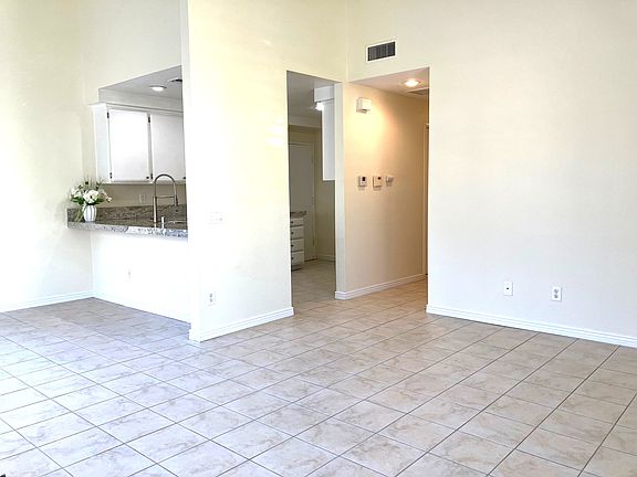 Very rare SINGLE STORY end unit home with no one above or below featuring an OPEN FLOOR PLAN, SPACIOUS LIVING AND DINING ROOM WITH CATHEDRAL CEILINGS, TWO LARGE PATIOS & ATTACHED GARAGE! Inside, enjoy air conditioning, fresh two tone interior paint, abundant natural light throughout and brand new luxury vinyl flooring in both bedrooms. Living quarter has recess lighting and custom plantation shutters. The remodeled kitchen features granite counter tops, stainless steel sink and appliances, a pantry with slide out drawers has an abundance of storage space, and a view from the breakfast bar into the patio perfect for dining or BBQ. Upgraded bathroom with designer vanity and a brand new shower/tub. Master bedroom boasts a walk-in closet and vanity. Second bedroom is appointed with mirrored closet doors. Attached large 1-car garage has direct access, storage lofts, and washer and dryer hook ups (washer and dryer provided as is). Add to that an assigned parking space directly in front of the property. Located in a peaceful neighborhood, this home offers a serene retreat while remaining close to shopping, dining, and entertainment options. Association pool, trash and water included in rent. No smoking-cigarettes or marijuana. No pets.