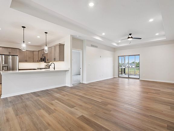 Located just a short golf cart ride from Denali's on the River and River Ridge Golf Course, this zero-entry condominium offers a spacious kitchen with quartz countertops, open to the living and dining areas. Just off the living room, you'll find a screened-in deck, perfect for relaxing. The stainless steel kitchen appliances are included! The primary bedroom features a bathroom with double sinks, as well as a walk-in closet filled with shelving. A hall bathroom, a second bedroom, and a laundry room with a pocket door complete the main floor of the home. Downstairs, you'll find a very large family room, a third bedroom and bathroom, an office or non-conforming bedroom, and a mechanical room. An oversized two-car garage is attached for added convenience. Call today for more information!