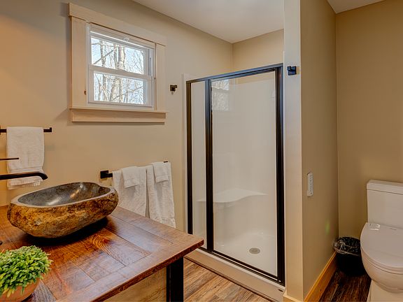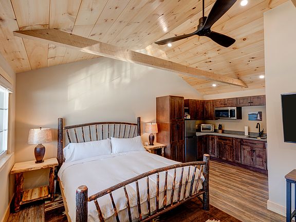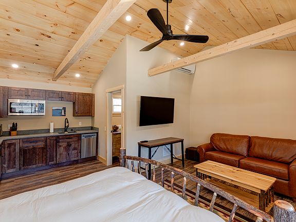 The kitchenette is fully stocked with all the amenities to eat in. The bathroom boasts a sanctuary of its own with glass shower. The shiplap vaulted ceilings and plush Adirondack style furnishings evoke relaxation after your day of adventures.
