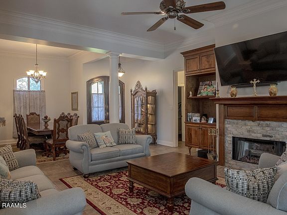 Stunning Move-In Ready home with 4 bedrooms & 3 full baths in the highly desirable Oak Trace subdivision in Sunset and priced below appraised value. You will first notice the oversized 0.63 Acre lot and the beautiful, lush and easy maintenance landscaping surrounding the house and grounds. Enter this exquisitely maintained home through the double glass front door into a beautiful walkway that opens to a cozy living room with gas fireplace featuring new brick surround plus formal dining space. Notice the large double picture windows over-looking the back patio that is the perfect entertaining space anytime of the year. The kitchen features brand new Quartz countertops, an island with a built-in stove, large breakfast area with fireplace and Plantation Shutters. The Master bedroom is spacious with beautiful hand scraped maple floors, plantation shutters, a walk-in closet, jacuzzi tub, dual Quartz vanities and water closet. 2nd and 3rd bedrooms also feature maple floors with large closets and Jack-n-Jull Bath. 4th bedroom/office space separate from other bedrooms near kitchen and offers Walk-In Tub bath. The covered patio with brick courtyard features an outside kitchen with custom Cedar wood working cabinets and sliding Cedar Door, wood burning fireplace and tv mount. Property also equipped with a 30x20, hardi-board workshop (insulated) with multiple covered carports to meet all of your storage needs. New deck in front of the shop another perfect entertaining space to enjoy those Louisiana evenings. Some recent updates include a 20kw Generac stand alone generator installed 2023. 2025 updates include interior paint on walls, trim and ceilings and all new Quartz countertops in kitchen, baths and laundry. Garage floor epoxy coating, additional attic insulation, french drains, additional gravel added and awning added to workshop. Great location and only minutes from the historical town of Grand Couteaux and 15 minutes from Lafayette.