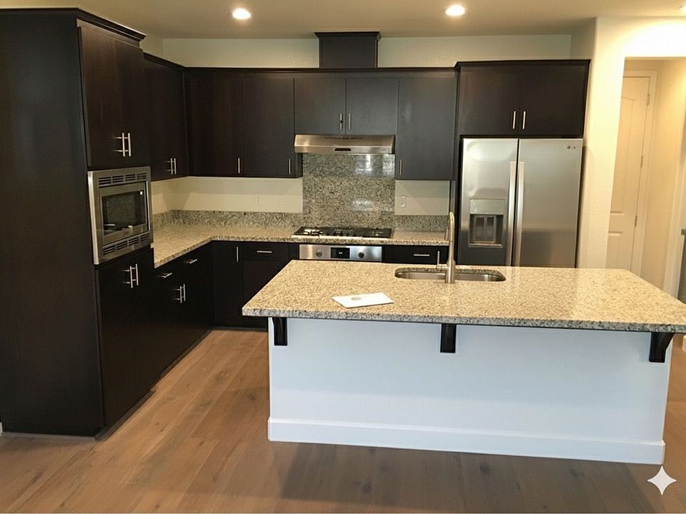 The gourmet kitchen features stainless steel appliances, an oversized island with a breakfast bar, and a brand-new refrigerator. The spacious primary suite includes a walk-in closet and dual vanity. Additional highlights include hardwood floors, high ceilings, recessed lighting, two-zone central A/C, and in-unit washer and dryer.