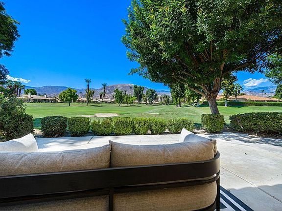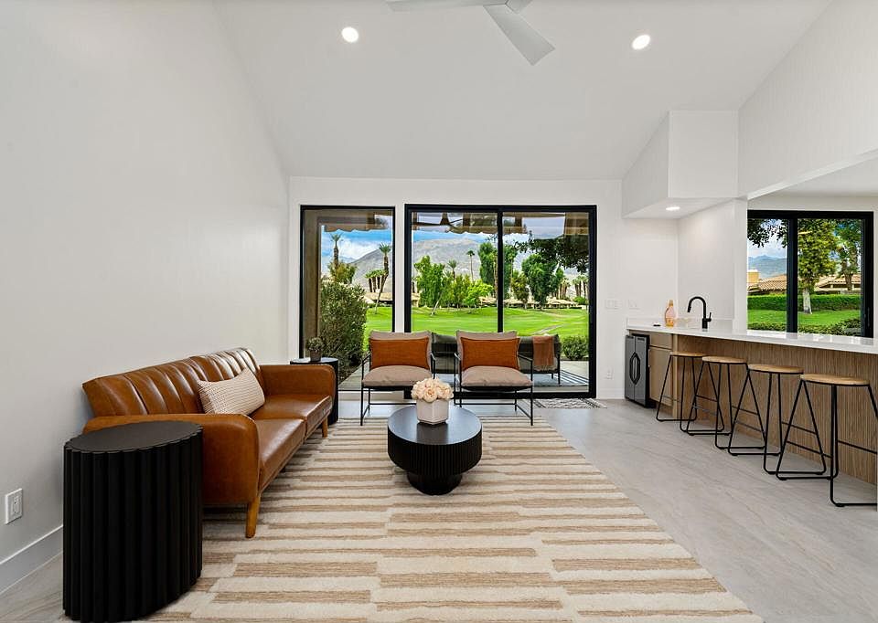 Light, bright, and airy, this fully reimagined home in Monterey Country Club captures panoramic Southern mountain views and organic modern design that balances sophistication, clean lines, and desert-inspired style. View now with 3D tour! ALL new windows, sliders and solid-core interior doors, which pair seamlessly with oversized 24x48 designer tiles throughout. The soaring VAULTED ceilings with transom windows above flood the OPEN-CONCEPT living room with NATURAL LIGHT, framing unparalleled southwest mountain views- including the iconic illuminated Cross Hike. Short term rental/AIRBNB approved = instant income potential! Smooth coated walls throughout the entire home. The chef's kitchen boasts custom white oak-style cabinetry, a passthrough bar window for seamless indoor-outdoor entertaining, KitchenAid appliances with RARE GAS range and hardware thoughtfully matched throughout the home. The expanded Primary Bathroom features a spa-like walk-in shower with MARBLE terrazzo tile, a floating waterfall double vanity, and a separate enclosed toilet. The Guest Bath impresses with warm Zellige tile, fluted wood vanity, and champagne-gold accents. The converted atrium serves as a Den with dramatic SKYLIGHTS, offering incredible flexibility as a home OFFICE or 3rd sleeping space. Perfectly positioned at the corner of the golf course and greenbelt, this home combines privacy, convenience, and resort-style living in one of Palm Desert's most sought-after communities. Additional highlights include new TANKLESS water heater, wet bar with sink, all new ceiling fans, sleek linear lighting, contemporary low-maintenance desert courtyard, patio with motorized awning, all elevating the modern aesthetic. Monterey CC offers a Clubhouse, fitness center, 27 holes of Ted Robinson designed golf, 13 tennis courts, 20 pickle ball courts, bocce, and 37 pools & spas.