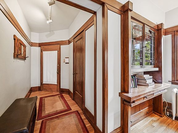 Rarely available architecturally significant John Van Bergen designed vintage Prairie Style 3 bedroom 2 bath condo featuring natural woodwork, original built-ins, art glass, and hardwood floors. Generous entryway/foyer. Large living room with beautiful woodburning fireplace opens to the lovely sunroom boasting north, east, and south facing windows. The formal dining room features beautiful built-in cabinets with art glass as well as art glass sconces. The spacious kitchen has wood cabinets and S/S appliances, adjoining office/ mudroom space. Central air. Deeded garage space! Fabulous location near the center of town.
