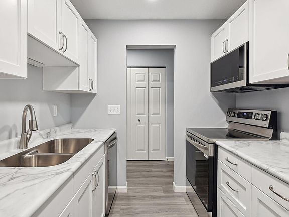 100% completely renovated unit! New, New, New! Kitchen, bath, floors, walls, fixtures it's all just been redone. Won't find a better unit at this price anywhere! Main floor walk out unit with patio. Large bedroom windows. Fleur Royale is a quiet building with a well-run association in the heart of Little Canada convenient freeway access with tons of amenities, including, heated indoor pool, large fitness room, sauna, party room, billiard room, hobby room, private BBQ space with landscaping and underground, heated garage. Association fee includes, heat, water, sewer.