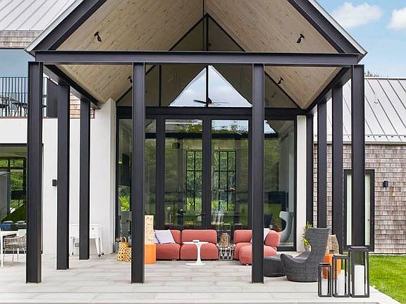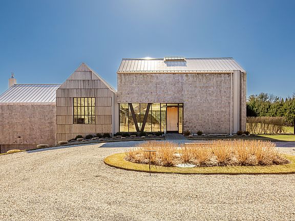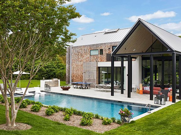 This stunning contemporary home offers 5,800 sq. ft. of impeccably designed living space with five bedrooms and six full baths. Thoughtfully designed for comfort and accessibility, the home is handicap-friendly, featuring wide entryways, an open layout, and a first-floor primary suite to ensure ease of movement throughout. Walls of glass, custom steel-framed doors, LaCantina sliders, and soaring ceilings fill the home with natural light. The open-concept main level boasts a striking kitchen with Leicht custom cabinetry, a waterfall island, and top-of-the-line Thermador appliances. The dramatic dining and living areas, with a 60" linear fireplace and wood-clad vaulted ceilings, lead effortlessly to the covered patio and expansive Turkish marble terrace. Outdoors, enjoy the 48' x 18' heated gunite pool and spa, built-in barbecue, and a sleek dining pavilion. The second floor offers three spacious en-suite bedrooms, while the finished lower level provides additional recreational space, a large laundry room, and flexibility for a gym, sauna, or wine cellar. Additional highlights include an oversized 2.5 car garage, EV charging station, a full-house backup generator, and a private, serene setting. Enter through the gated entrance and experience seamless ,stylish and comfortable living. A truly unique modern retreat, available for your summer escape.