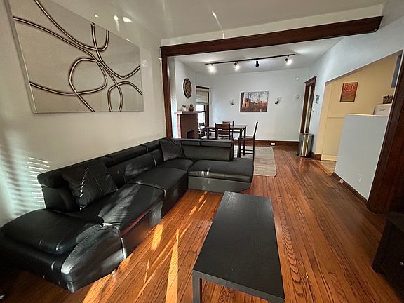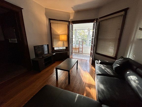 It features a separate living and dining room with decorative fireplace. Cute little kitchen with refrigerator and stove. Enclosed porch with French doors and a comfortable sofa- perfect for reading! Nice shared backyard. Plenty of street parking available!