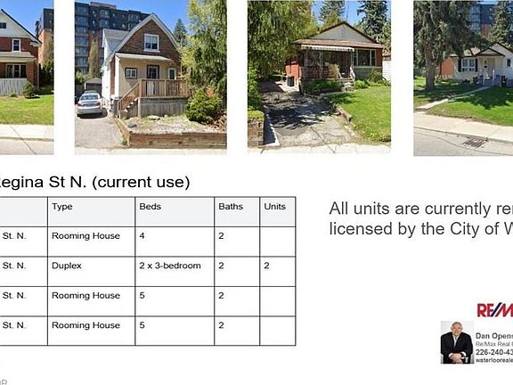 For your reference, please click on the link to the sales brochure showcasing a similar project with an equivalent lot size and zoning. This example provides valuable insight into the potential scope and scale of development achievable with this unique assembly. **Exceptional Land Assembly Opportunity – Prime Location Adjacent to Wilfrid Laurier University** Presenting a rare opportunity to acquire a land assembly consisting of four properties located at 179, 181, 183, and 185 Regina Street. Ideally positioned directly across the street from Wilfrid Laurier University, this site offers unparalleled proximity to the campus and is surrounded by thriving amenities. The combined development site features favourable RMU-81 zoning, allowing for a wide array of future possibilities. All four properties are to be acquired together, providing a substantial land footprint for investors or developers. All properties are currently rented and generating until re-development.