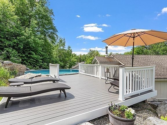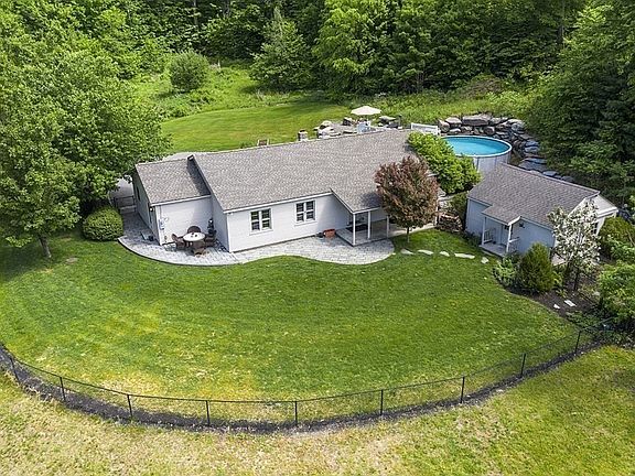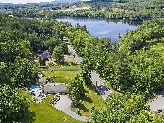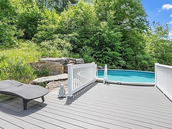 Absolutely CHARMING & MODERN ranch style home is sited beautifully on landscaped lot overlooking Crocker Pond. Open concept flr plan with a farmhouse vibe offers the perfect combination of comfortable indoor living and fabulous outdoor space. A generous mudroom w/closet space transitions into a lge entry room before opening up to the front to back living space. A renovated kitchen w/upgraded cabinetry/solid countertops and center island offers a combo eat in/dining area. Full bath w/custom tiled shower, stone FP, laundry and 3 bdrms completes the interior. An outdoor oasis surrounds the home! Covered patio, stone walkways, raised gardens and above ground pool recessed into a stone backdrop w/large composite deck for summer fun. A separate out building serves as a storage room OR maybe a future she/he shed! Love to kayak/canoe/hike? Right across the road, between the trees, you will find a hidden gem where you can access hiking trail for Crocker Pond OR the kayak launch.