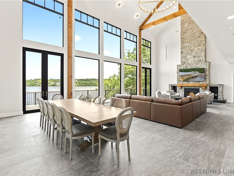 As you enter, be greeted by soaring double-height cove ceilings with magnificent large wood beams, complemented by 10-foot Pella windows and doors that flood the space with natural light. A striking 25-foot stone-finished chimney anchors the grand room, adding warmth, elegance and character. The gourmet kitchen boasts high end Viking appliances and a central island, ideal for entertaining. Multiple social areas and 2 decks provide perfect spaces for gatherings with breathtaking lake views. Luxury abounds in every detail, from a custom sauna in 1 of 2 master suites to Kohler fixtures and premium hardware. High-end finishes ensure both style and function. Enjoy a new 2 well dock with a swimming platform for effortless lake access. An automated lighting system enhances convenience, while custom chandeliers and pendant lights add sophistication. Designed by a renowned architect specializing in hotels and resorts.. A perfect Lake Retreat. This home is great for families and entertaining. Designed like a resort. Luxury finishes and amenities. Luxury at the lake. Schedule a private showing today before this masterpiece of a home is gone! FURNISHED & TURNKEY!