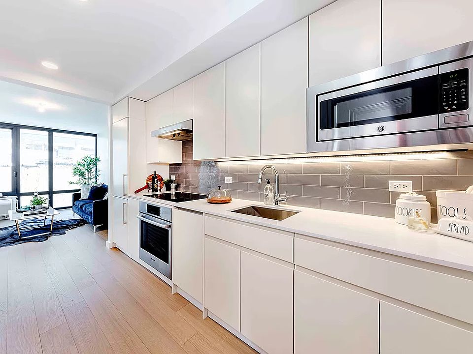 This spacious unit features floor-to-ceiling windows offering great sunlight throughout the day, European oak flooring, PTAC heating and cooling units, and an open kitchen layout including built-in Bosch appliances, Tiger Industries custom painted wood cabinetry, Ceaserstone coutertops and gorgeous backsplashes. The bedrooms have enough space for comfortable bedding and extra storage. The custom-designed bathroom boasts a Duravit vanity, Grohe fixtures, Moen accessories, a mirrored cabinet, and a deep soaking tub.