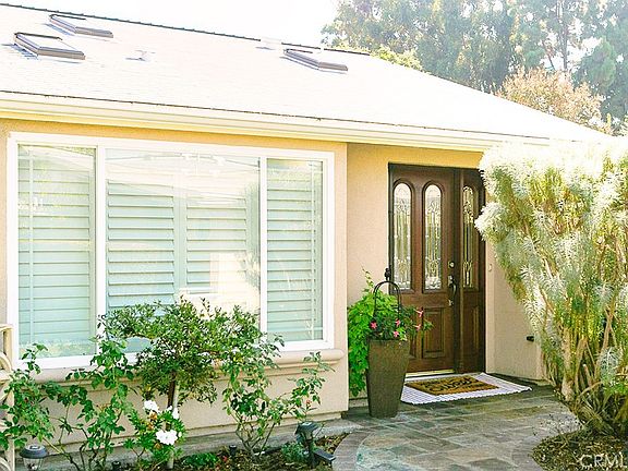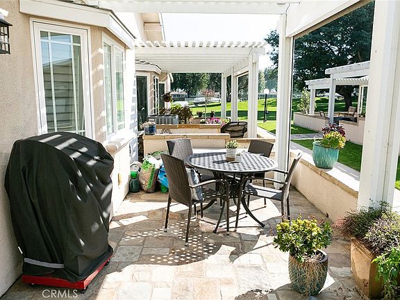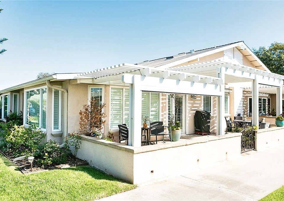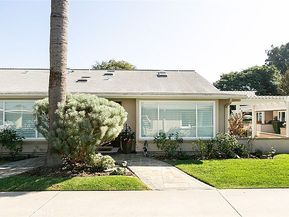 Beautifully updated end unit just steps from the golf course in Leisure World’s highly desirable Mutual 14! This expanded home has been tastefully remodeled inside and out, offering an inviting open-concept floor plan filled with natural light from numerous windows and four skylights. The spacious great room design creates a comfortable, airy living space featuring a cozy fireplace, perfect for relaxing evenings or gatherings with friends. The living area flows seamlessly into a stunning modern kitchen showcasing granite countertops, an extra long center island, stainless steel appliances, custom designer-painted cabinetry, and convenient pull-out shelving throughout. Both bathrooms have been beautifully remodeled with quality finishes, and both bedrooms include custom built-ins. The 2nd bedroom has a large built in desk with cabinets, perfect for a home office, craft room, or guest space.