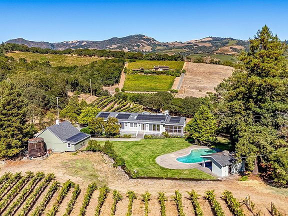 Set amid the rolling hills of Sonoma Valley, this captivating 11.34 acre property embodies the essence of Wine Country living. Surrounded by vineyards, oak-studded hills, and sweeping valley views, this tranquil estate offers a rare blend of privacy, comfort, and natural beauty. The farmhouse residence features 3 bedrooms and 3.5 bathrooms, a bright open floor plan, and expansive windows that frame breathtaking scenery from nearly every room. Entertain with ease in the spacious living areas or step outside to enjoy the sparkling pool and sprawling lawn overlooking the vines. A screened-in porch provides the perfect spot to unwind at sunset, dine al fresco, or simply take in the serenity of the landscape. The boutique vineyard adds both charm and authenticity to the setting, creating a true Wine Country retreat. Modern conveniences such as solar panels and updated systems complement the home's relaxed elegance. Located just minutes from Kenwood and Glen Ellen, this property offers easy access to world-class wineries, dining, and hiking trailsyet feels worlds away from it all.