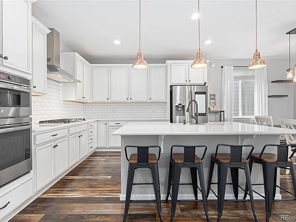Welcome to this beautifully maintained ranch home in the highly desirable Anthology neighborhood of Parker. Impeccably cared for, this home features high-end upgrades throughout, with carefully chosen paint colors and rustic wood floors that create an inviting atmosphere. The kitchen is the focal point, showcasing stunning copper lighting, luxurious marble countertops, stainless steel appliances, and a massive island perfect for both meal prep and entertaining. The spacious family room is highlighted by a custom shiplap feature wall, adding warmth and character. The oversized primary suite offers a spa-like ensuite bathroom with dual sinks, a step-in shower, and an upgraded walk-in closet. Two additional bedrooms on the main level are separated by a full bathroom, providing privacy for family members or guests. The finished basement extends your living space with a large recreation area and a stylish wet bar, ideal for entertaining. Two additional bedrooms, each with walk-in closets, a bonus room currently used as a home gym, and a full bathroom complete the lower level. Step outside to the beautiful backyard, featuring an expansive Trex deck, perfect for outdoor dining and entertaining. The large yard provides more space than many others in the area, and a dog run with gravel, added in 2024, is perfect for pet owners. With a two-car garage and solar panels installed in 2022, this home is both efficient and eco-friendly. Located close to commercial centers and the charming Old Town Parker, this home offers the perfect combination of style, space, and convenience.