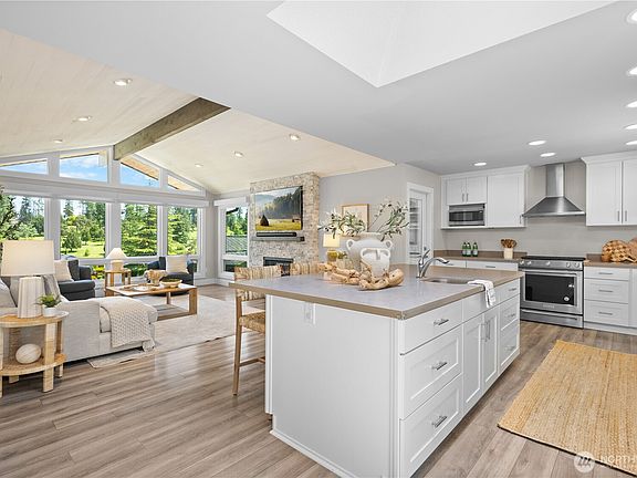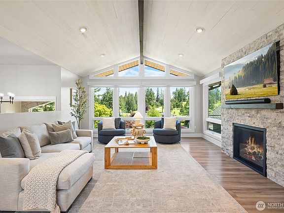 Live the Tam O’Shanter lifestyle in this fully renovated 4-bed + den, 2.5-bath home. Enjoy open-concept living with chef’s kitchen, dining, and vaulted living area that showcase stunning golf course views through floor-to-ceiling windows. Glass sliders open off the kitchen to a fully fenced, low-maintenance, turfed backyard with large entertaining deck. The primary suite offers a walk-in closet, built-ins, and spa-like bath with walk-in tile shower. Large bonus room also with views downstairs, laundry with wine fridge, 2-car garage + separate golf cart garage with ample storage. HOA includes golf, pool, clubhouse with restaurant, pickleball & more. Top-rated Bennett Elementary and Interlake HS. Minutes to Microsoft, Amazon, 520 & I-90.