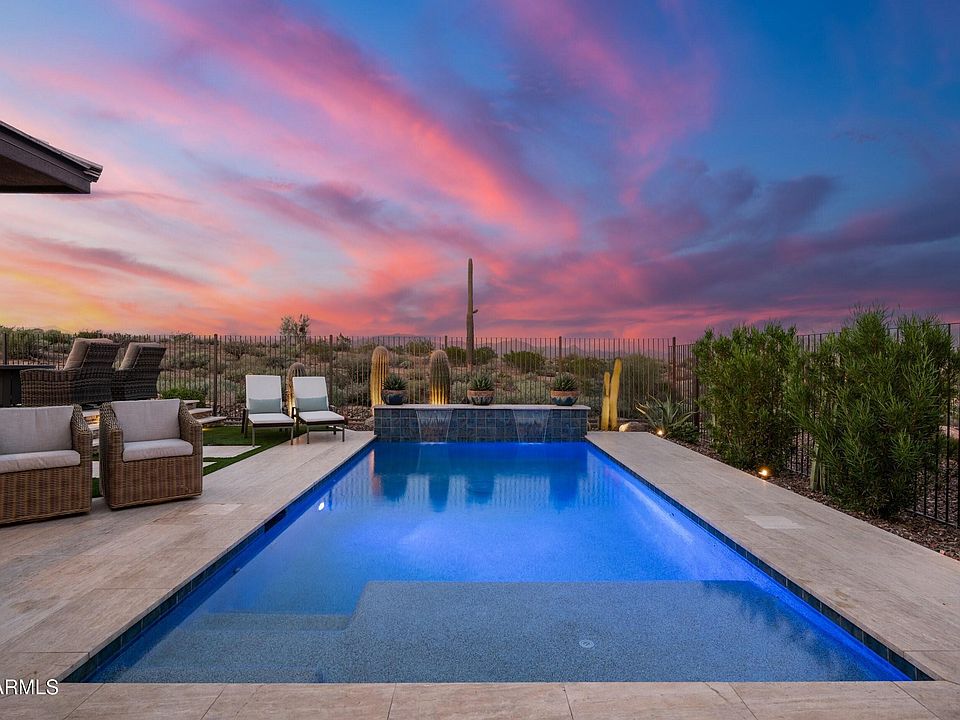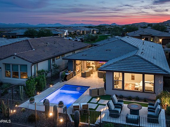TAKE IN SPECTACULAR MOUNTAIN VIEWS FROM THIS PREMIUM LOT HOME BACKING DIRECTLY TO THE TONTO NATIONAL FOREST. This stunning home offers unmatched privacy from the backyard desert oasis complete with a gorgeous pool, relaxing water features and an elevated firepit seating area perfect for taking in the dramatic scenery from every angle. The expansive patio also includes upgraded landscape lighting and a custom gas fireplace perfect for enjoying beautiful AZ evenings. Home features an open concept contemporary living space w/ beautiful, sleek finishes and thoughtful detail given to every design element. Other features include a luxurious primary suite w/ a booming view, guest suite, full office, a premium indoor/outdoor immersive audio system, and so much more. AZ Resort living at its best.