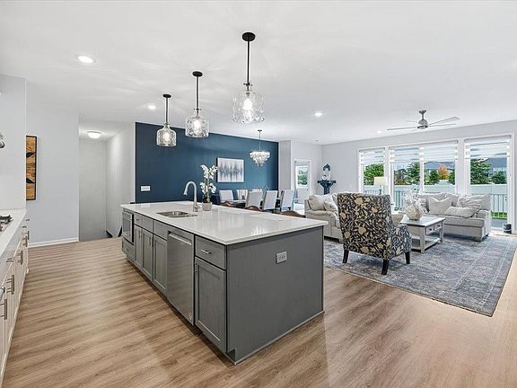 Former model home is move-in ready and better than new construction! The covered front porch opens into the inviting entry with decorative wall paneling. This home is so much larger than you expect when looking at the outside!! The gorgeous kitchen features a center island with bar stool seating, quartz counters, double wall ovens, cooktop, & walk-in pantry. 9-foot ceilings are throughout the main level & floor-to-ceiling windows on either side of the sliding glass door fill the living room with natural light & provide easy access to the oversized 16 x 20 deck & backyard. A gas-burning fireplace with stone surround & built-ins creates a cozy focal point. The main-level primary suite boasts a box-vault ceiling & luxurious private bath with walk-in shower. Two additional bedrooms & a full bath complete the main floor. The finished lower level is perfect for entertaining with a large family room, full bar with refrigerator, & a second stone-surround gas fireplace. Two additional bedrooms & a full bath offer plenty of space for guests or family. Sell your lawn mower & kiss your snow shovel goodbye: the association takes care of all your lawn maintenance & snow removal!