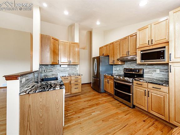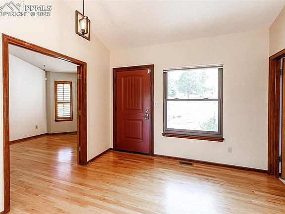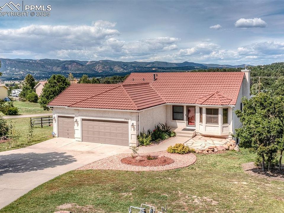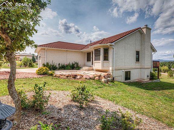 This lovely ranch home is nestled among other beautiful homes on large lots, so lots of privacy. Once you enter the house you’re greeted with hardwood floors and vaulted ceilings which opens up to the main floor living space. The kitchen offers newer stainless steel appliances (2021) and granite countertops. A cozy breakfast nook with granite table top and mountain views. The open floor plan flows from the kitchen to the dining area to the family room where you can enjoy the cozy gas fireplace. You can walk out of the family room to the Trex deck that over looks your 3/4 acre yard and even more of those beautiful mountains views. The main floor primary suite has bay windows so you can sit and enjoy your morning coffee and more mountain views. The attached 5 piece bathroom comes with soaking tub, dual sinks, and granite countertops. There is also a large walk in closet. The main level also offers is an office that can also easily be used as a fourth bedroom. The walkout basement offers a large finished area with a gas fireplace and plenty of room to entertain. There are also two bedrooms and a 3/4 bath in the basement. The very large utility room also has plenty of space for all your storage items. This home boasts a newer fire resistant Stone Coated Steel Roof (Oct. 2022), newer 50 gal water heater (2022), newer high end Renewal by Andersen doors and windows (2021-2022). Other upgrades and amenities include a central vacuum system, whole house humidifier, central A/C, radon mitigation system, and a 3 car garage. The refrigerator, washer, dryer and outdoor cameras all convey. The Woodmoor HOA includes security! All this and close to all that Monument has to offer with plenty of shopping, restaurants and outdoor activities and easy access to I-25. Come and enjoy this lovely, move in ready home.