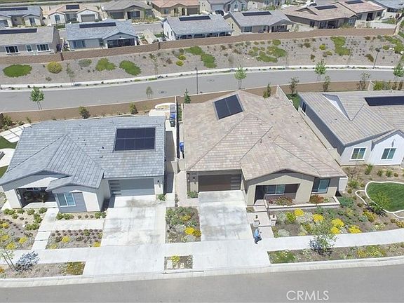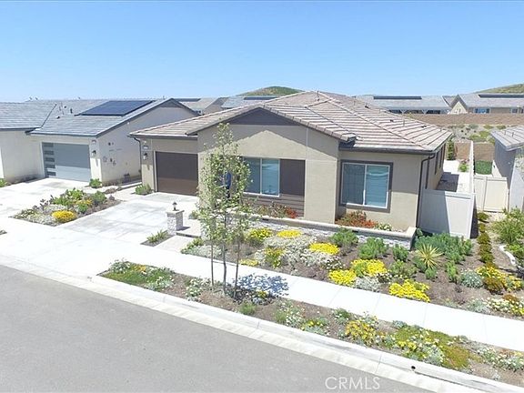 Altis at Skyline 55+ community. NO MELO ROOS. Owned Solar! 3 Bedroom 2.5 Bathroom Plan 4 model; Bedroom three configured as builder optional Den. High ceiling welcomes you. $25,000 lot premium. $70,725 in Builder upgrades including owned solar, plus fully professionally landscaped rear yard including above ground spa. Kitchen is Open to the Living Room and Dining Room, perfect for Entertaining! Kitchen features granite counters, gas cooktop, double ovens, cabinets with quiet close hardware, pot & pans drawers, Island/Breakfast Bar and Pantry. Living Room with fireplace, recessed lights and plantation Shutters. Dining room with sliding glass doors to the Patio and Backyard with Spa. Primary Bedroom with built-in entertainment/storage center and walk-in closet. Primary Bathroom with low threshold walk-in shower, dual sink vanity and water closet. Bedroom two with large storage closet is near Full Guest Bathroom with Walk-in jetted tub. Laundry Room with utility sink. Guest Powder Room, Tankless Water Heater. Plantation Shutters throughout. Fully landscaped Backyard with Covered Patio and Spa.