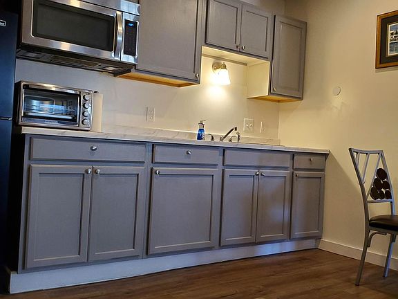 - Equipped kitchenette, with sink, Microwave, Full Fridge, Toaster Oven, Air Fryer, Stove Top (2 Burners), and Utensils.