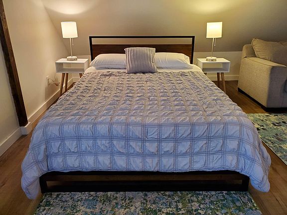 - Queen size bed with bedding.